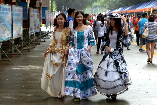 上午9时,各学院摊位开放咨询。裙带飘逸的汉服,温文尔雅的青花瓷纹旗袍,大波浪裙摆的欧洲宫廷装,别具特色的东南亚风情服装,还有象征公平与理性的法官服,分别彰显了中文、西语、东语和法学院的特色,在校道上构成了一道道亮丽风景线。