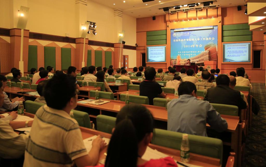 本网讯 11月29日,全国外语外贸院校人事工作协作会2014年年会在我校举行,教育部人事司副司长赵丹龄、广东省教育厅副厅长魏中林、人事处处长陈东海,广东省教育研究院副院长黄崴,人力资源和社会保障部事业单位人事管理司岗位管理处处长梁江,我校校长仲伟合以及来自北京外国语大学、上海外国语大学、对外经济贸易大学、上海对外经贸大学等共15所外语外贸院校的校领导、人事部门负责人,广东省内中山大学、华南理工大学、暨南大学等13所本科高校的人事部门负责人及我校二级学院人事工作管理负责人约100人参加了本次年会。会议开幕式由我校副校长阳爱民主持。