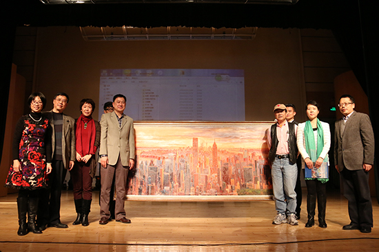 演讲中,黄添创谈起赠送给我校的《金色帝国》。他说这是一幅以黄昏下的纽约为背景创作的城市全景画作,全画以黄色为主色调,展现出落日余晖映照下纽约城中零次栉比的摩天大厦,帝国大厦、世贸中心、布鲁克林大桥在画中清晰可辨,给人大气、磅礴的深刻印象。这幅画作曾参加国内外多个画展,有人评价道:“这幅画在画展中就是令人瞩目的中心。”