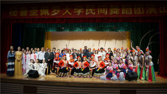 随行舞蹈团会与广外学生联袂献上“梦幻秘鲁,锦绣中华”民族舞蹈演出。秘鲁舞蹈团表演了北部水手舞、剪刀舞、童德罗、欢庆舞、瓦里查等传统民族舞蹈。这支由年轻大学生组成的青年舞团通过秘鲁三个区域(沿海、山区和雨林地区)的特色舞蹈展现了秘鲁的艺术和文化。开场的北部水手舞,男舞者手挟草帽,女舞者指拈手绢,言笑晏晏旋身环舞。充满传奇色彩的剪刀舞原为祭祀之舞,洋溢着原生态的淳朴和狂野。舞者服饰华丽,动作粗犷奔放,洒脱豪迈,赢得观众热烈的掌声。