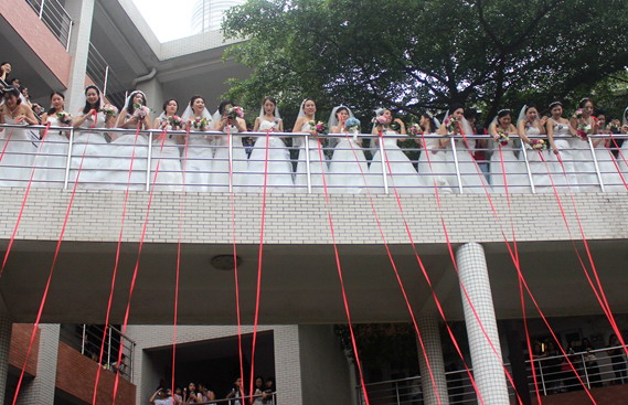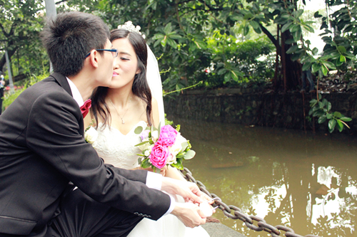 当天,伉俪们体验了一场中西合璧的迎亲活动。上午9点半,独具特色的“宿舍接亲”开始。新娘在我校第13栋宿舍楼中等候,随着新郎伴郎嘹亮的“妹妹大胆往前走”的喊亲声,由我校50名学生组成的伴娘团先一步出现在走廊上,向宿舍楼下的新郎和伴郎团“讨红包”。新郎伴郎不仅要“高歌”,还需要“脱衣服”和“做引体向上”,过关斩将直到新娘抛红绳与新郎成功牵线后,新郎才可在一楼迎接新娘。伉俪们手牵手来到了相思河畔。他们在护栏上挂上一个个同心锁,寓意锁住他们的爱情,一生相爱相随。随后,伉俪和亲友们重游大学校园,回味着记录他们青春年华的点点滴滴。