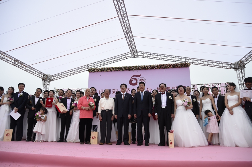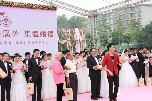 本网讯 5月23日,校园里一改昔日的宁静,到处弥漫着热烈温馨的气氛,50对广外校友伉俪从世界各地回归母校举行校园婚礼,并为母校50岁生日献上祝福。这是我校首次举行集体婚礼,本活动也是广外50周年校庆系列活动的重要一环。