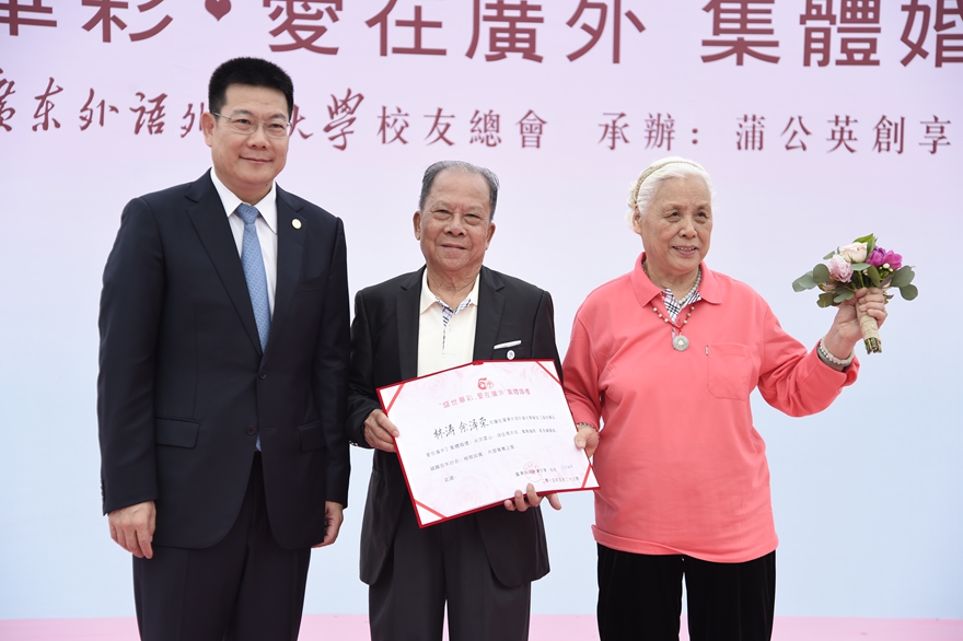 海南校友、83级日语专业王泽沔、84级日语专业王聆聆夫妇是广外50岁同龄人,集体婚礼上,他们用“一段广外路,一生广外情,一世广外人,一生一世520”表达了对母校感谢。广外首届毕业生、65级关飚、张小安伉俪则将“情定云山,青梅竹马”这句话送给了50对伉俪,也送给了广外。