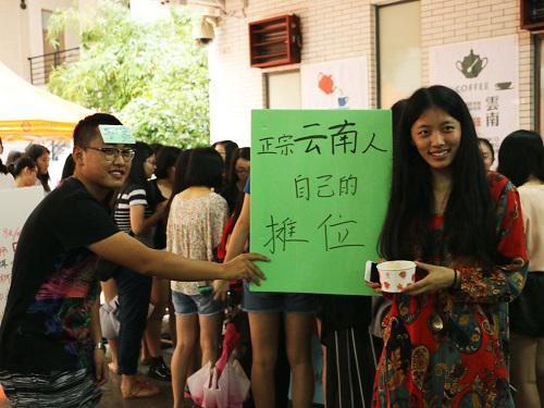 云南美景展区各个摊位向同学们尽情展示了云南的浪漫、纯净之美,一张张明信片、一片片书签、一幅幅图片,把苍山、洱海、玉龙雪山还有香格里拉的自然之美呈现的如梦如幻,牢牢吸引住了同学们的眼睛,忍不住驻足欣赏。看过了美景自然少不了尝一尝美食,远远地就被浓浓的馨香勾起好奇心,原来同学们早就沏好了云南普洱并且热情的向大家推荐品尝。