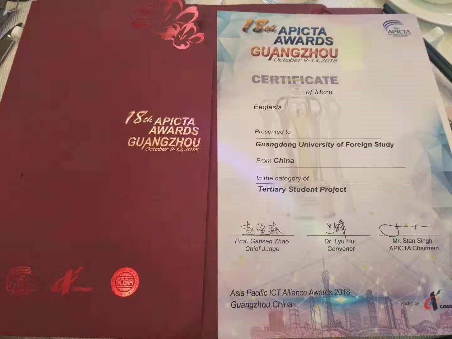 本网讯 10月13日晚,第十八届亚太信息通讯科技大奖赛(APICTA)在广州花园酒店闭幕。我校信息学院选派的EAGLESIA(鹰眼看中国)参赛队伍荣获Tertiary Student Project类别的Merit奖项,在大学生组中位列第四,是本届大赛中大学生项目类别中唯一获奖的中国大陆队伍。
