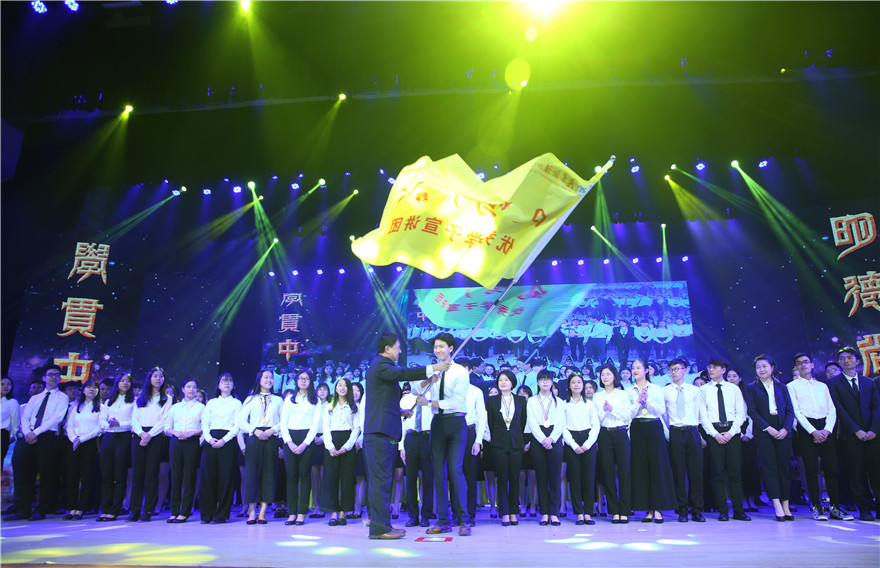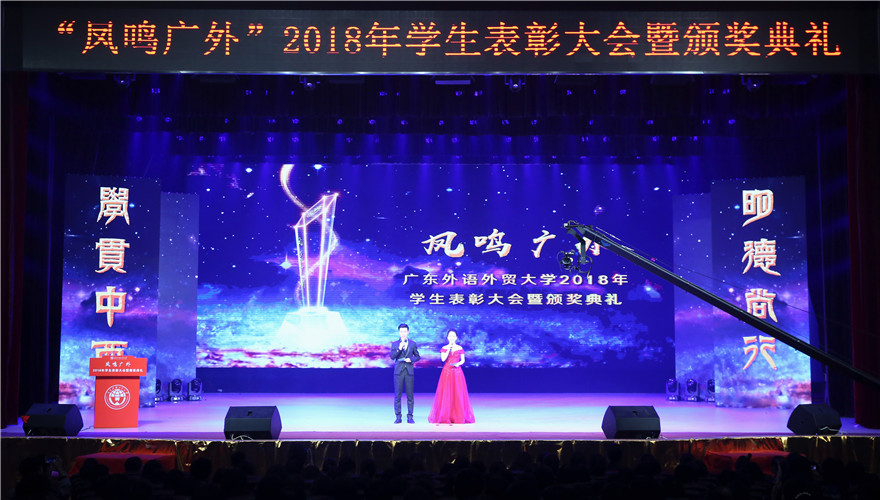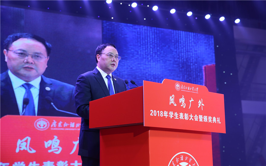 本网讯 寒来暑往,四季轮回;广外学子,熠熠生辉。12月6日晚,“凤鸣广外”2017-2018学年度学生表彰大会暨颁奖典礼在北校区云山会堂举行,大会表彰了林菁等44名“国家奖学金”获奖者、麦润慈等860名“国家励志奖学金”获奖者、广外法律援助中心等3个团队和陈群等6名个人“校长奖章”获得者、地里热巴·阿克帕尔等29名“民族学生奖学金”获奖者、英文学院英语1602班等20个“先进班集体标兵”以及社会专项奖学金获得者。本次大会还增设了现场直播,让更多的师生能够观看颁奖典礼,一同见证这荣耀的时刻。我校党委书记隋广军为优秀学生宣讲团授旗,校长石佑启,校党委副书记李云明,副校长刘海春等领导出席颁奖典礼。