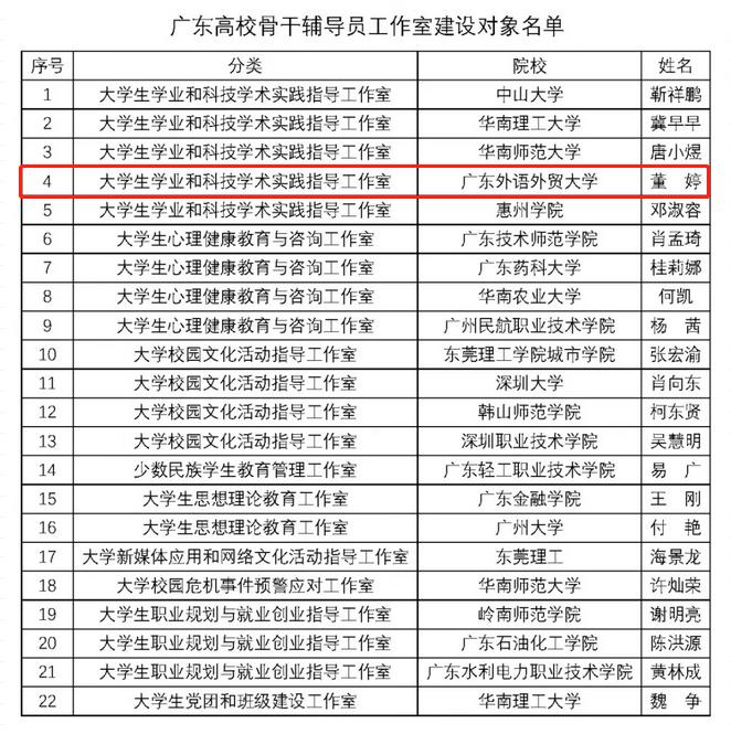 广东高校骨干辅导员工作室是由广东省教育厅主办、依托教育部高校辅导员培训和研修基地(华南师范大学)在全省建立的高校骨干辅导员工作室,旨在深入贯彻落实中共中央、国务院印发的《关于加强和改进新形势下高校思想政治工作的意见》和教育部《普通高等学校辅导员队伍建设规定》精神, 进一步加强高校辅导员队伍建设,发挥团队作用,为辅导员职业化专业化搭建示范引领平台。本次广东高校骨干辅导员工作室建设项目共22个工作室入选“建设对象”,28个工作室入选“培育对象”。据悉,广东高校骨干辅导员工作室“培育对象”经一年内考核合格后,可直接转为“建设对象”。