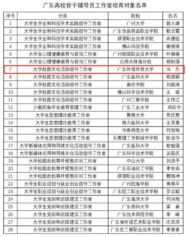 广东高校骨干辅导员工作室建设对象名单