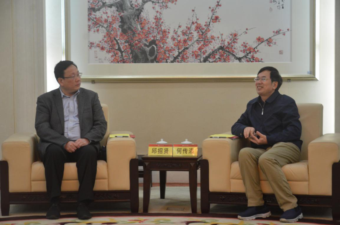 本网讯 2月26日,广东省贸促会党组成员、副会长邱招贤一行来访。我校党委常委、副校长何传添在南校区校办公楼迎宾厅会见来宾,双方就联合举办经贸活动等事项进行了交流。