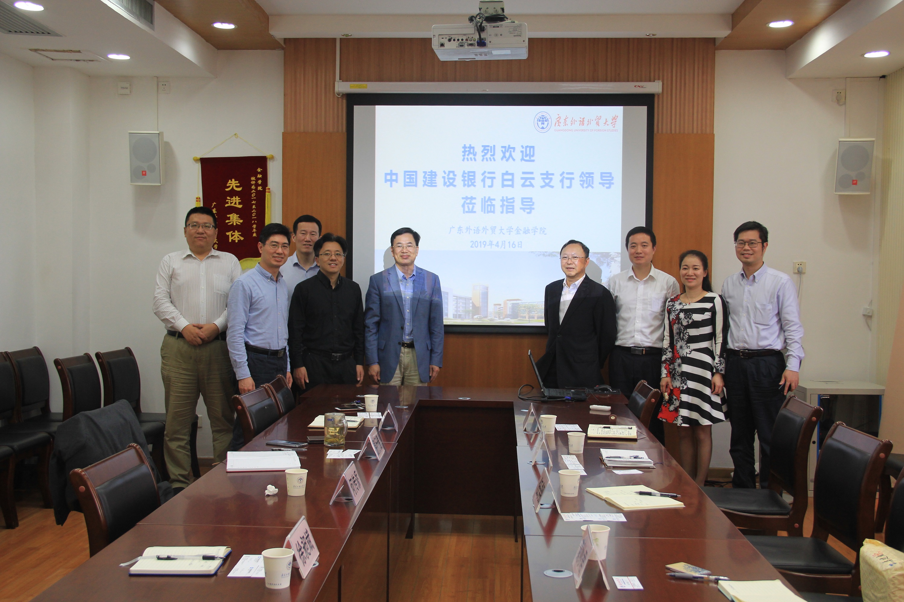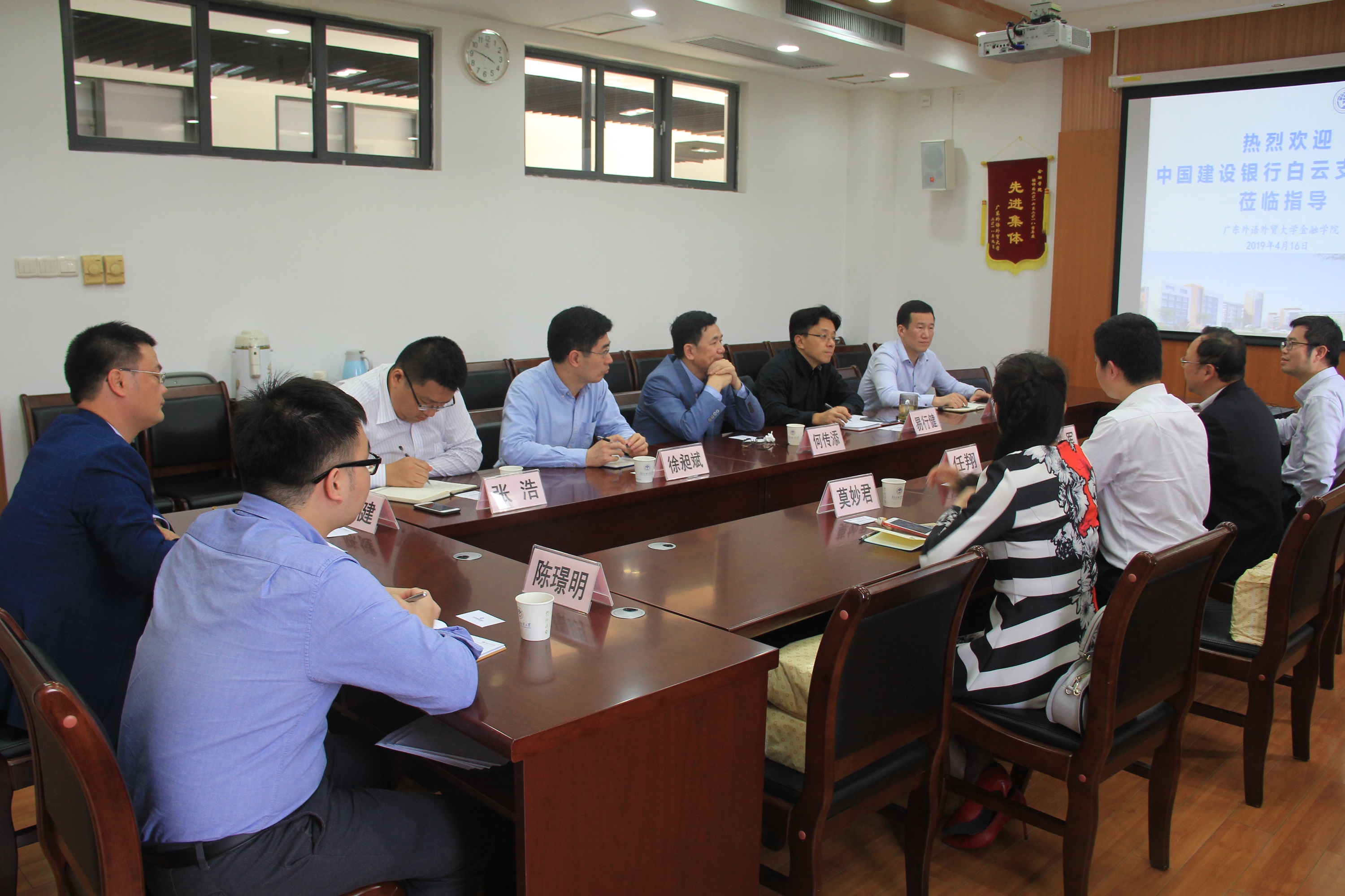 本网讯 4月16日下午,中国建设银行白云支行副行长刘军、中国建设银行广州分行机构部经理任翔来访我校金融学院,与我校副校长何传添以及金融学院党政领导就金融学院与建设银行的合作发展、课程教学、实习基地和人才培养等内容进行了深入的交流讨论。