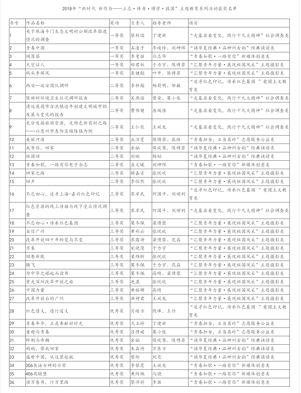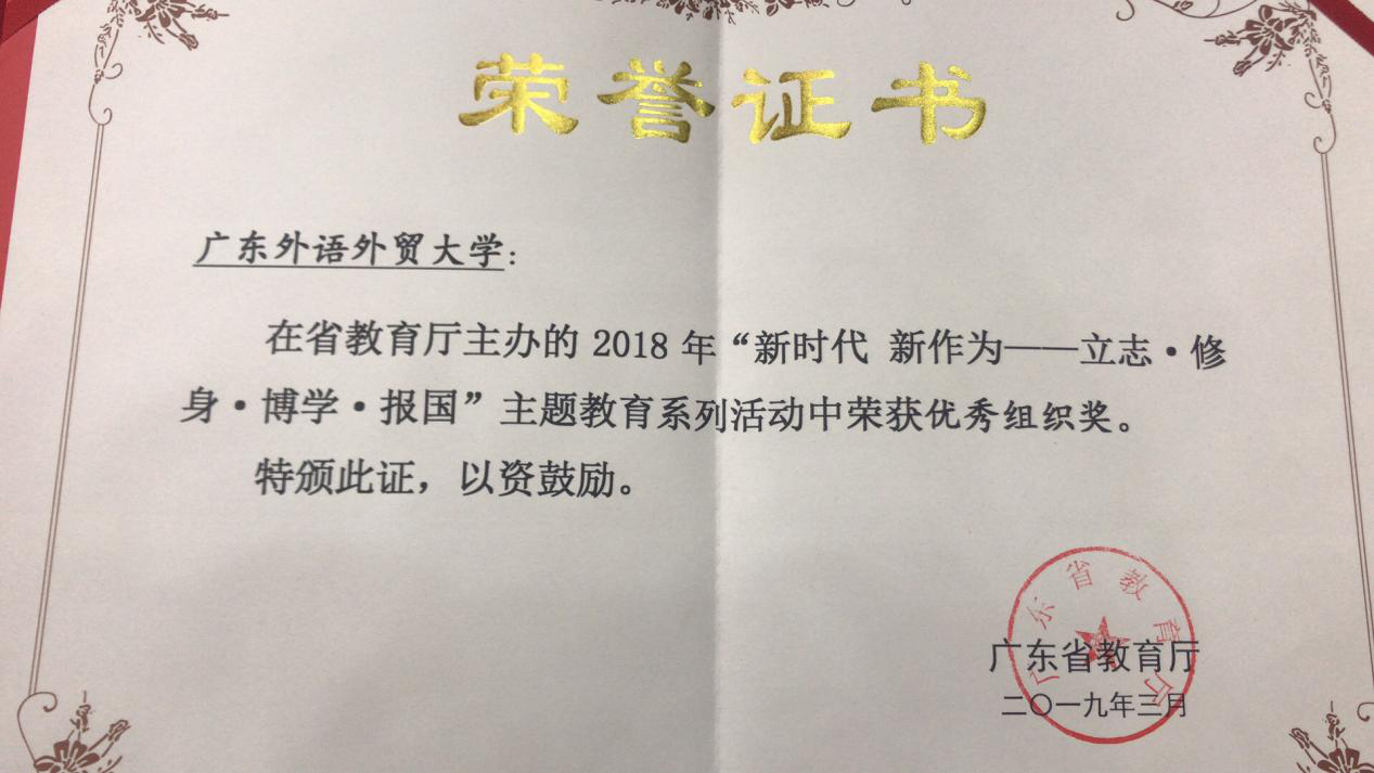 本网讯 近日,广东省教育厅公布了2018年“新时代 新作为——立志·修身·博学·报国”主题教育系列活动获奖名单,我校获一等奖共5项,二等奖共10项,三等奖共12项,优秀奖共9项。我校第九次获“优秀组织奖”荣誉称号。