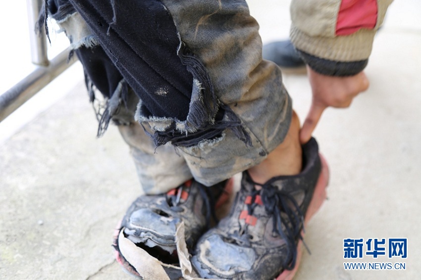 图为山区孩子穿到已经破洞的鞋子。新华网发(受访者供图)
