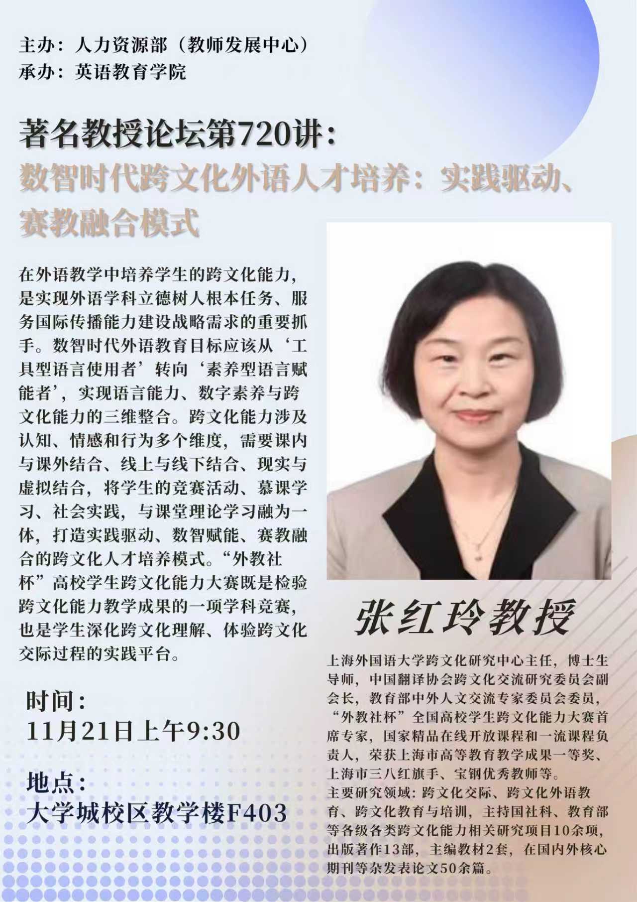著名教授论坛第720讲:数智时代跨文化外语人才培养:实践驱动、赛教融合模式
