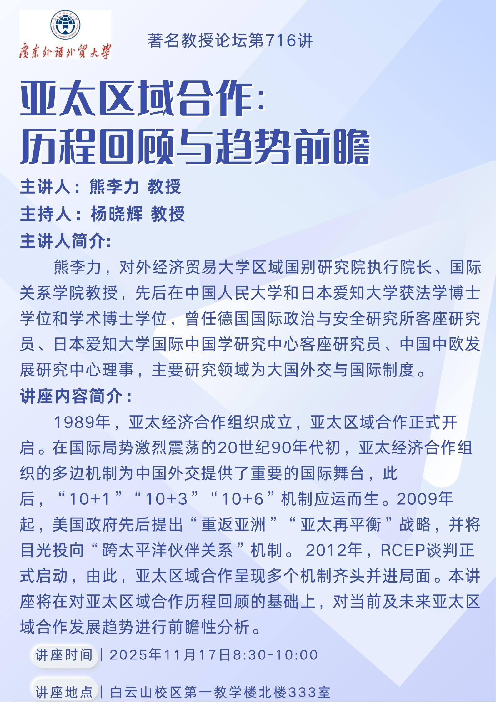 著名教授论坛第716讲:亚太区域合作:历程回顾与趋势前瞻