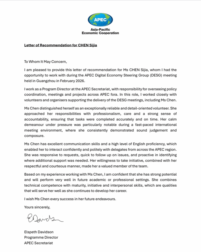 此次APEC第一次高官会的志愿服务,让广外多语志愿者在奉献中收获了成长,他们在服务中锤炼了专业技能,拓宽了国际视野,增强了责任担当,成为青春风采的展示者、城市文明的传播者、祖国发展的亲历者、亚太友谊的见证者。亚太经济合作组织秘书处项目总监Elspeth Davidson致信高度赞扬志愿者的专业服务,美国、智利等国参会代表也为志愿者点赞,称赞他们的服务“专业、高效、暖心”。这些认可不仅是对志愿者个人的肯定,更是对广州志愿服务水平的高度赞誉。