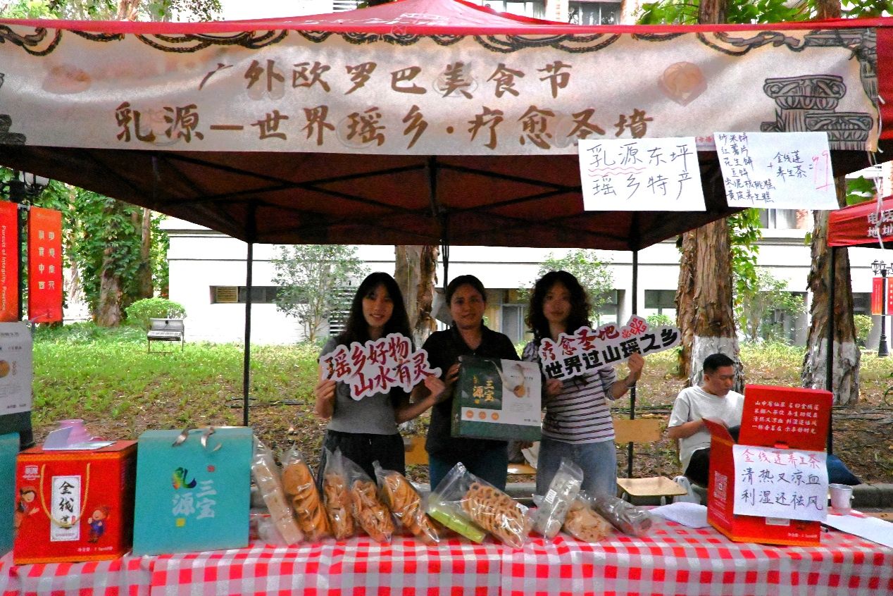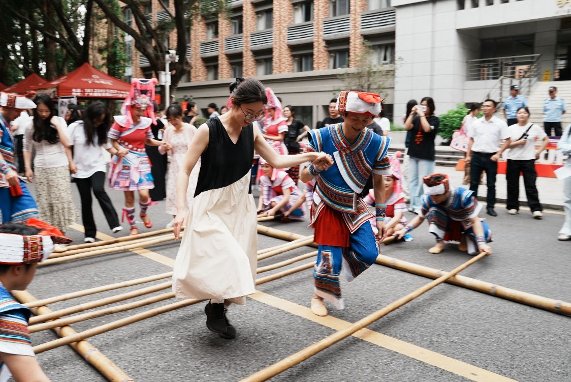 本届文化节的一大亮点,是学校“百千万工程”结对单位的倾情参与。清远乡村振兴特色摊位前人头攒动,笋尖、清远鸡、五指毛桃等农特产品从田间直达校园,师生们在品尝地道农味的同时,感受乡村发展的蓬勃活力。乳源瑶族自治县的特色展位则以民族文化点亮现场,身着瑶绣服饰的瑶族同胞现场演绎竹竿舞——作为国家级非物质文化遗产,瑶绣被誉为“穿在身上的史书”,而竹竿舞的互动体验,让嘉宾与师生在欢声笑语中,沉浸式感受过山瑶文化的独特魅力。来自白云区永平街岭南新世界片区党群服务中心的“邻里暖屋”慈善超市摊位则带来慈善好物义卖、特色文创展销、暖心手作体验,用一份小消费传递一份大爱心,同时现场招聘志愿者,让青春与善意同行,用实际行动温暖邻里。