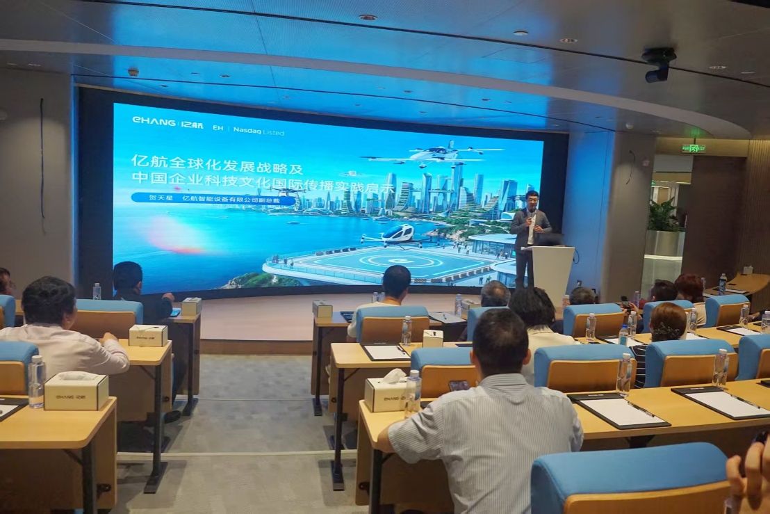 亿航智能副总裁贺天星以《亿航全球化发展战略以及中国企业科技文化国际传播实践启示》为题作报告,介绍了公司的发展历程、核心技术突破、业务战略布局以及无人机系列产品的研发与应用情况。随后,双方围绕“智能传播技术如何赋能企业全球化传播”“国际传播人才如何服务科技出海”“校企联合开展实战化教学案例开发”等议题展开了深入交流。
