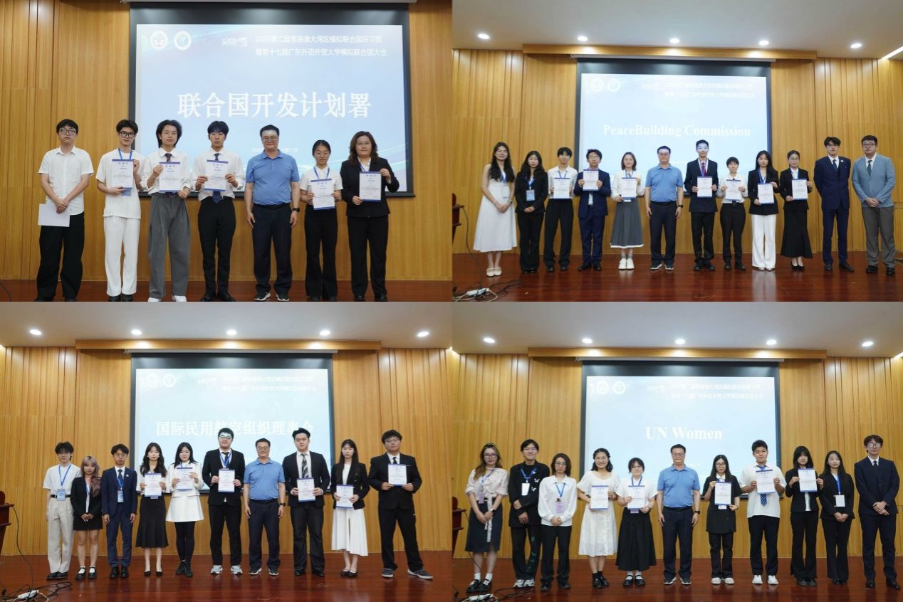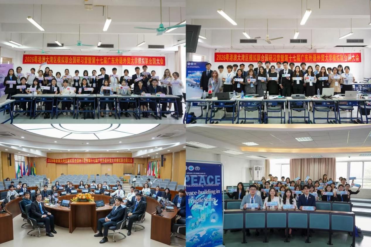 本网讯 4月16-19日,2026年第二届粤港澳大湾区模拟联合国研习营暨第十七届广东外语外贸大学模拟联合国大会在广东外语外贸大学大学城校区举办。本次活动由广东外语外贸大学主办,区域国别学院(国际关系研究院)、共青团广东外语外贸大学委员会和广东外语外贸大学模拟联合国协会承办,中共广州市委外事工作委员会办公室、广东省科技合作研究促进中心、广东外语外贸大学国际治理创新学院、广东国际经济协会、广东省青年科技创新研究院等共同支持。内地及港澳40余所高校及中学的169名师生代表齐聚广外,开启跨学科、跨地域、跨文化的全球治理探索征途。