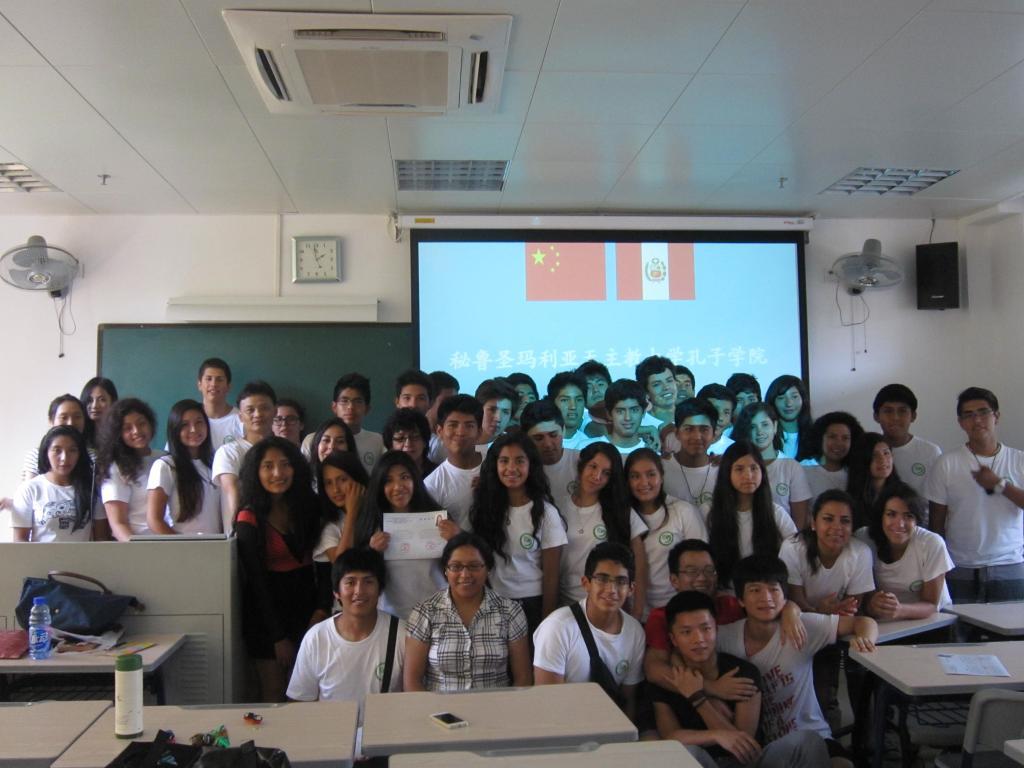 本网讯 2014年7月23日下午,秘鲁圣玛利亚天主教大学孔子学院夏令营闭营仪式在第七教学楼215室举行,秘鲁圣玛利亚天主教大学孔子学院中方院长易宗勇、秘鲁圣玛利亚天主教大学带队老师胡里奥、莉莉、苏珊及四十名秘鲁学生出席了闭营仪式。