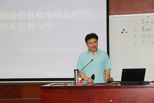 开班典礼仪式结束后,项目组邀请了英语语言文化学员欧阳护华教授为培训班的学员们作“网络信息和全球化时代的英语教与学”的主题讲座。欧阳教授从信息时代英语知识的飞速发展与课本知识的落后说起,引出如何在网络化和全球化环境下进行有效而有用的英语教学。他说,中国要走向世界需要大量具有文化独立意识、善于平等交流合作的英语人才。传统教学法已不适应社会发展需要,希望学员们能改变“习惯合理化”、“‘精读’教学法”等固有的教学习惯,积极探索“体验反省式、人本主义、个性化合作式”的真理方法,为信息时代的外语教学树立新标准。