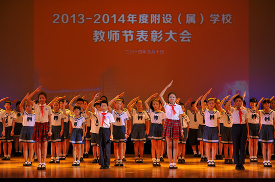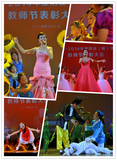 颁奖结束后,在场嘉宾共同观看了精彩的文艺汇演。五所基础教育学校都为文艺汇演贡献了精彩的节目。其中,广外外校的管乐合奏气势恢宏、激情四射,幼儿园的童话剧《守株待兔》师生同台充满童趣;增城外校的歌舞《新星升起》是在广外的校歌《凤鸣岭南》的旋律上谱出了新词,肇庆外校的舞蹈《我可喜欢你》演出了孩子们的天真活泼,单纯可爱。值得一提的还有,附属中小学专门为本次演出创作了一首配乐诗朗诵《献给广外基础教育教师的歌》,为广外基础教育战线上的广大教师献上了一份美好的节日祝福。
