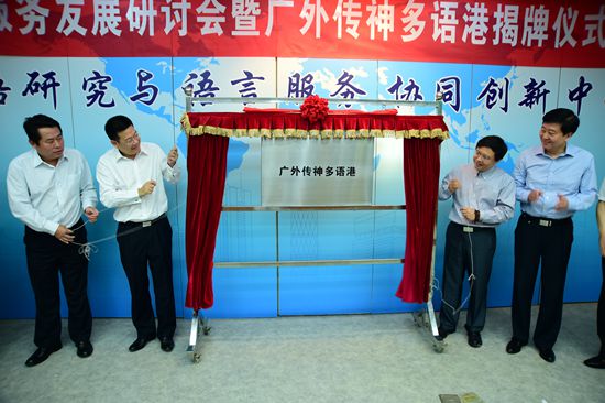 本网讯 9月12日上午,我校与传神(中国)网络科技有限公司联合建立的“广外传神多语港”揭牌仪式暨语言服务发展研讨会在北校区六教B108会议厅举行。广外传神多语港将致力于发展成为领先的即时语言服务支撑平台、高端语言人才培养基地以及重大科研项目培育基地。传神(中国)网络科技有限公司总裁何恩培、常务副总经理傅强,我校校长仲伟合,副校长顾也力、何传添及学校相关单位负责人出席了仪式。仪式由顾也力主持。