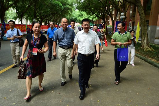 仲伟合一行人前往各个学院宿舍慰问新生,他说道“希望你们团结奋进,成为四年的好伙伴。” 他尤其赞成翻译学院自2008年以来实行的“一对一”老生带新生的帮扶方法,即60名高翻新生都有自己专属的师兄师姐一对一指导学习和生活。“这样双方互利的好办法值得推广开来。”报到现场还有自主创业的学生在卖自己设计的减震鞋垫。校长见此慷慨解囊买下了一幅鞋垫,并鼓励几位学生继续坚持创业。此外,他还来到学校的各个饭堂了解学生餐饮情况,并叮嘱工作人员保证食品的安全性、继续完善宿舍楼的基础设施建设。卢景辉对云山勤工所属的邓老凉茶和云山水榭营业状况进行指导,他说道:“做这些对学生们来说是相当不容易的,但同时也能够锻炼他们的能力”。在喝了一杯凉茶后,卢景辉自己刷了卡,以“留下印记”。