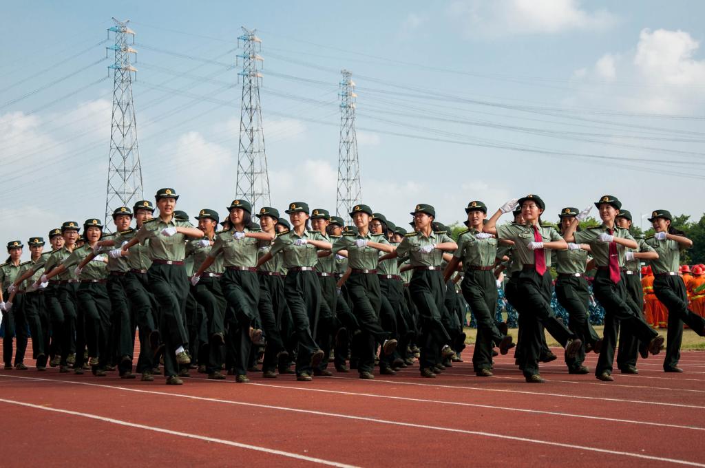 在军事技能表演中,由210名女生组成的匕首操方阵让人眼前一亮,她们手持战斗匕首,展示我军实战中的战斗技巧;擒敌方阵的战士们个个眼神凌厉,充满斗志,完美诠释了精锐之师的含义。