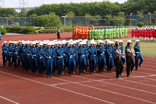 鉴于近来恐怖事件频发,今年军训汇演增加了战场救护演练。在演练中,反恐小组手持步枪,穿越火线,成功制服“恐怖分子”并解救受困群众。场上队员精彩的演技和熟练的操作搏得了看台观众的阵阵喝彩。最后消防队员手持干粉灭火器迅速入场,成功扑灭大火。
