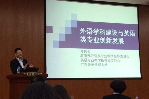 会上,我校16名师生代表与来自全国高校的400多名商务英语教学与研究领域的专家学者,围绕本次研讨会的主题“教学质量标准建设和商务英语专业人才培养”进行了深入探讨。仲伟合做了题为“外语学科建设与英语类专业创新发展”的主题发言。他首先介绍了外语学科概况、内涵与范畴,阐释了我国高等教育由英语专业到英语类专业变迁的历史背景、发展阶段、面临的问题、发展趋势,并以三份教学大纲为主线介绍了从英语到英语类(含英语、翻译和商务英语三专业)的现状,尤其着重强调了“新国标”对于英语类专业创新发展的指导和要求。从2007年全国第一个商务英语本科专业正式得到教育部批准设立,到目前已经有216所高校开设了商务英语专业。针对这一快速发展的现状,根据“新国标”,仲伟合在发言中详细介绍了商务英语专业的培养目标、商务英语人才知识与能力构成、课程设置、商务知识标准、教学原则、教学方法与手段,并提出了六条新的发展思路,得到了与会专家和学者的一致赞同和响应。
