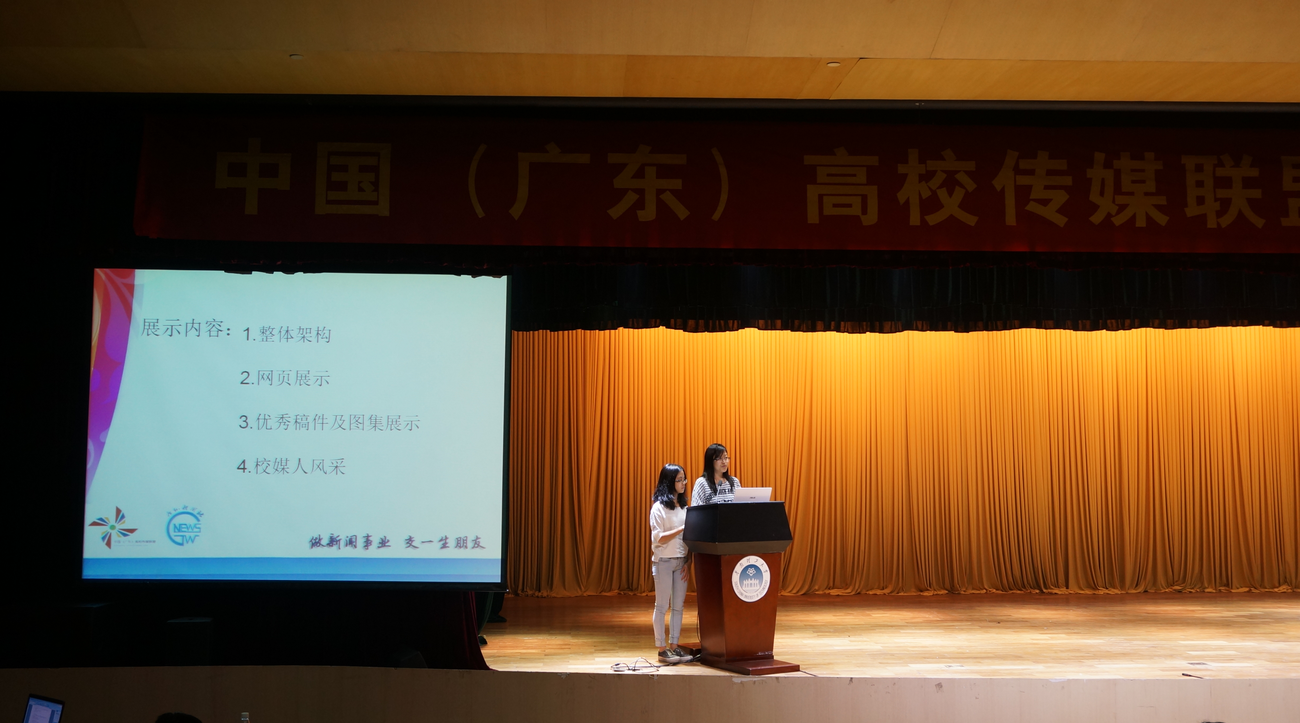 在第二轮的展示环节中,在高校传媒联盟执行主席高正佳致辞后,十五强校园媒体以各具特色的展示方式,开启了最后角逐。中山大学中大青年传媒,华南师范大学新闻社,华南理工大学百步梯等多家校园媒体以丰富的展示内容阐释了他们的媒体理念。广外新闻网在第八位出场,由新闻社社长王佳主讲,以展现广外校园美感和学生青春动感的图集吸引眼球。我校校媒的独特之处在于采取“报网合一”的运作模式和“师生合作”的管理模式,主打网站资讯,传递消息及时迅速,充分发挥了当今网络信息时代的优势。