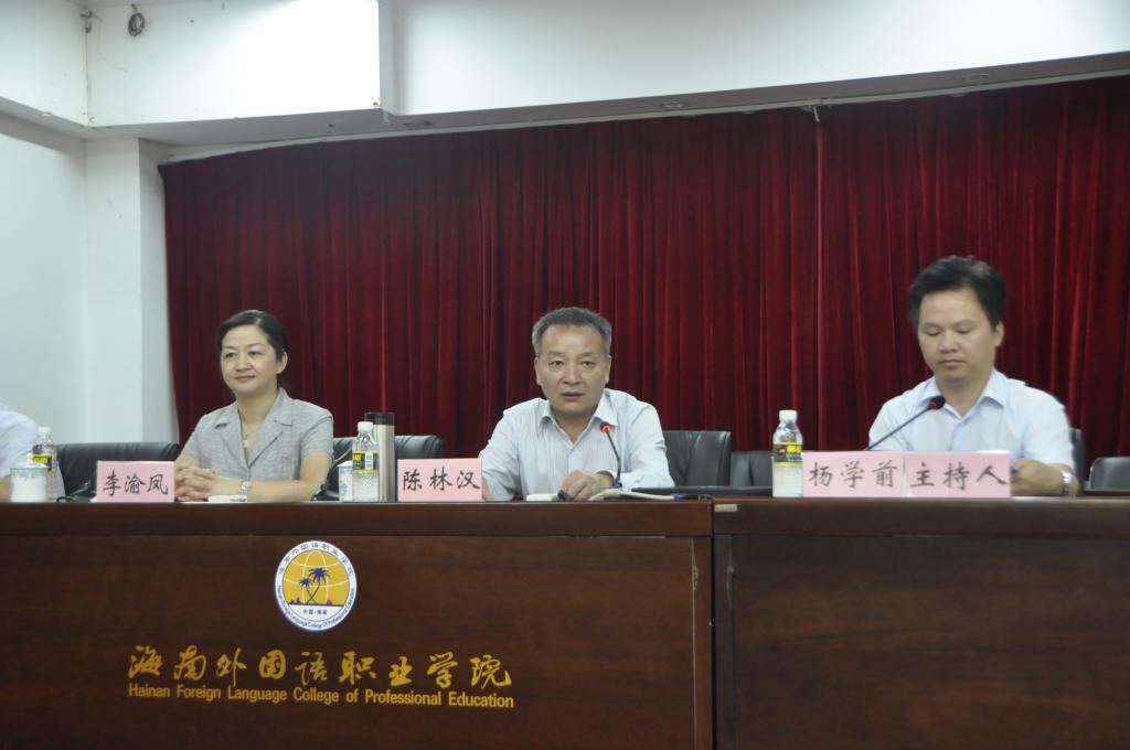 本网讯 10月29日上午,由我校副校长陈林汉带队的一行在海南外国语职业学院(以下简称“海外院”),举行“2014学年度‘2+1、2+2’专接本‘卓越’班项目推介会”启动仪式。参加启动仪式的有海外院院长李渝凤、海外院英语、日语、旅游等专业的学生300多人以及海外院相关职能部处和教学单位的负责人和教师,仪式由海外院副院长杨学前主持。随行的有我校继续教育(公开)学院院长何勇斌,副院长任跃忠、陈开举等。