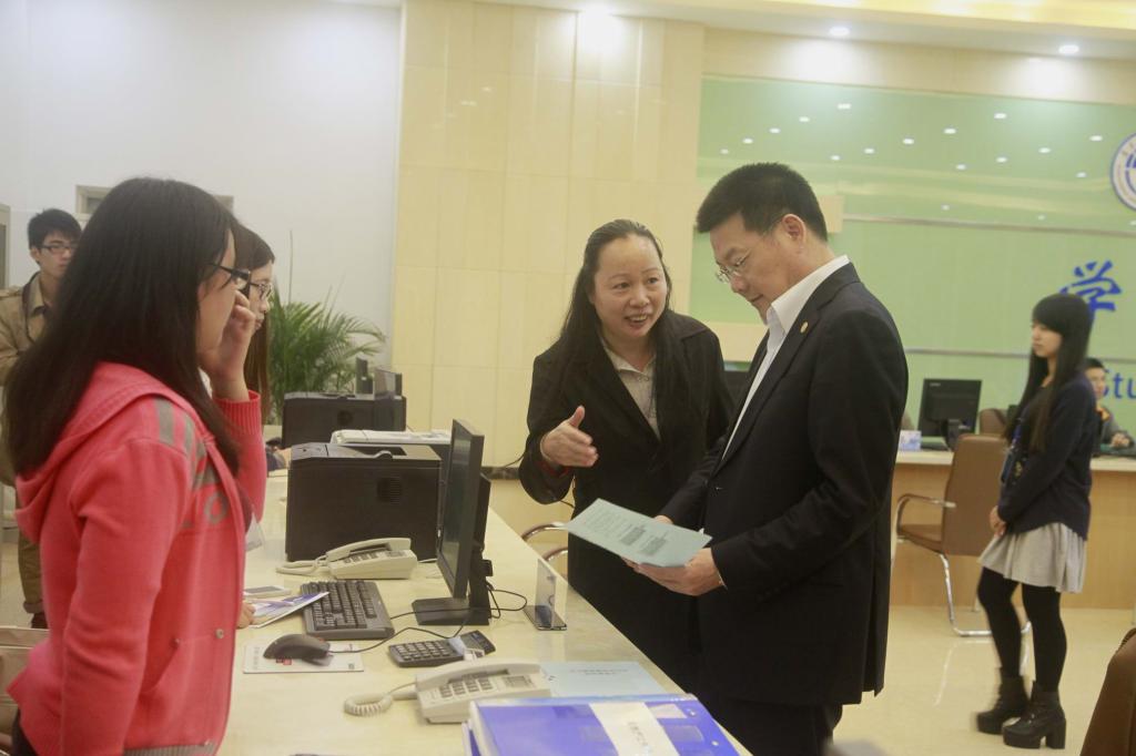 本网讯 在揭牌启用后的第二个工作日,广外学生服务大厅迎来了一位特殊的“服务对象”——校长仲伟合。11月10日,在校党委副书记卢景辉及相关部门负责人的陪同下,仲伟合到刚启用的学生服务大厅一尝服务。