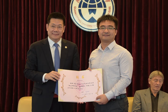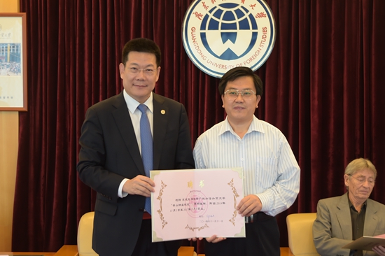 仪式上,仲伟合代表学校对五位学者的加盟表示热烈欢迎,希望学者们的加盟进一步壮大我校的高层次人才队伍,推进相关学科的发展。他提到,学校近年来依托“云山学者”岗位引进了一批国内外知名专家学者,这些学者来自世界各地,拥有不同学术背景,他们思想的交流与碰撞,创造了浓厚的学术氛围。他对五位学者未来对广外的学科建设、教学科研等方面发挥的作用充满信心与期待。