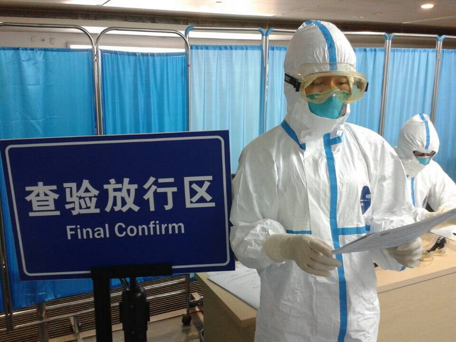 本网讯 近日,我校西语学院法语系的12名学子走上了抗埃博拉的最前线,他们穿上防护服、戴上防护用具,在广州白云机场协助来自几内亚等埃博拉重疫区的旅客填写核查各种信息。