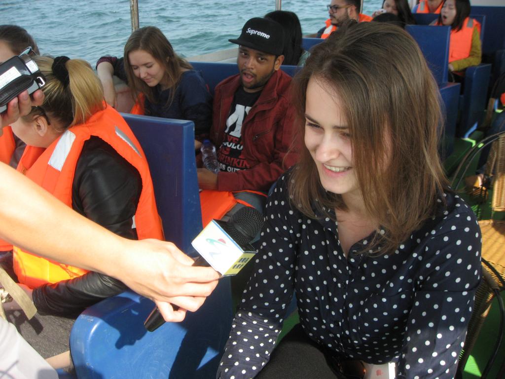 11月16日上午,留学生们在工作人员的带领下参观了海陵岛保利皇冠假日酒店,酒店内环境布置非常漂亮,与沙滩只有几步之遥,留学生们都很喜欢这一景点,一时流连忘返。随后,一行人到达港湾,踏上渔船,扬帆出海,体验捕鱼之乐,感受大海的魅力。海陵区委还安排了海陵岛电视台在渔船上采访了留学生代表。