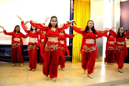 伴随着阿拉伯传统音乐的响起,舞蹈“一千零一舞”开始了。身穿阿拉伯传统服饰的八位男生俏皮登场,尽显地道风情。紧接着,披着长长红头纱的十位女生踏着舞步缓缓走出,后仰摆手,转腕提胯,极具阿拉伯的韵味。