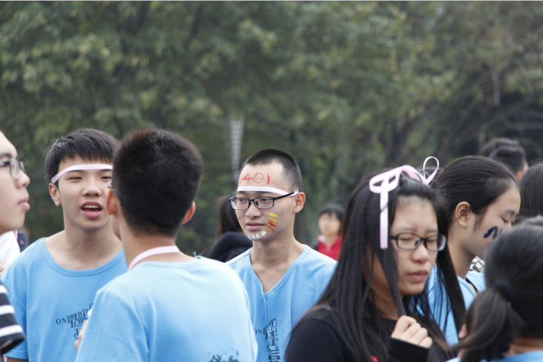 热身的班级中,齐刷刷穿着蓝色班服,脸上涂着五彩颜料,头上绑着丝带的物流1401的同学吸引了记者的眼球。他们还特意配备了一个后勤人员,专门帮他们拿衣服、拍照,骑着骑单车全程“护航”。看来他们是想来一场酷跑。