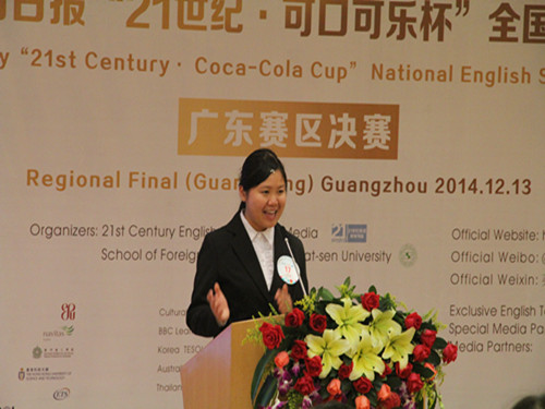 本网讯 12月13日,第二十届中国日报“21世纪·可口可乐杯”全国英语演讲比赛广东赛区决赛在中山大学举行。来自广东众多高校的23名选手参与本届比赛的角逐,我校英语教育学院学生周冬妮在比赛中脱颖而出,最终获得本次比赛亚军,并获得了参加全国总决赛的机会。