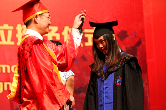 在毕业宣誓仪式后,卢景辉和陈林汉分别宣读了《关于授予2014年冬季毕业生学位决定》和《关于聘2014年冬季毕业生担任校友联络员的通知》。随后,仲伟合逐一为毕业生们颁发学位证书并一一拨穗。