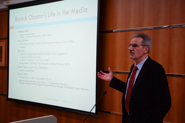 当晚,德国约翰尼斯•古腾堡大学(美因茨)教授Alfred Hornung发表了以《跨国总统奥巴马》(“Barack Obama: a Transnational President”)为主题的演讲。他追溯了美国总统奥巴马的政治和生平轨迹,并针对其在自传、视频文献、竞选广告、公众形象等大众传媒中营造的自我形象进行了分析,主张奥巴马这个首位非洲裔美国总统是一位跨国界、跨民族/种族和跨文化的总统。在演讲最后,他还特别提到了大众文化对奥巴马形象的几个解构实例。随后,他就奥巴马的政治遗产、多元民族关系等问题与观众进行了互动。