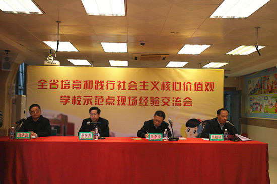 省委宣传部副部长蔡伏青讲话强调指出,培育和践行社会主义核心价值观要明确主题,责任到位,做好社会主义核心价值观工作的氛围营造;要高度注重社会主义核心价值观塑造师生心灵的作用;要加强核心价值观工作的组织领导,建立长效机制,将核心价值观全面融入学校教育全过程;要发挥示范点的示范作用,及时总结经验、做法。