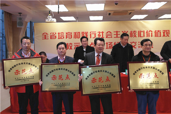 本网讯 12月29日下午,由省委宣传部、省教育厅联合举办的全省培育和践行社会主义核心价值观学校示范点现场经验交流会在广州市越秀区东风东路小学召开。会议为培育和践行社会主义核心价值观学校示范点单位进行授牌。我校马克思主义学院等18个单位获批广东省培育和践行社会主义核心价值观学校示范点。我校党委宣传部部长胡文涛、马克思主义学院党总支书记卢海清参加会议。