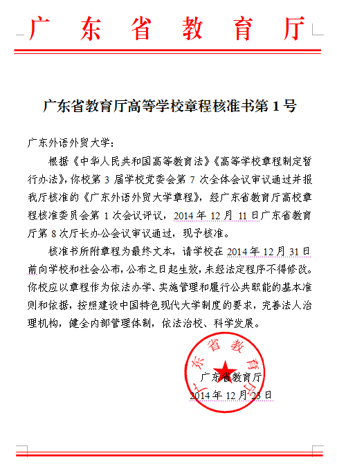 本网讯 近日,省教厅发布的《广东省第高等学校章程核准书第1号》通过了《广东外语外贸大学章程》,我校章程获省教厅首家核准公布。据悉,此次省教厅首批核准通过了包括广外在内的4所省属高等学校章程。