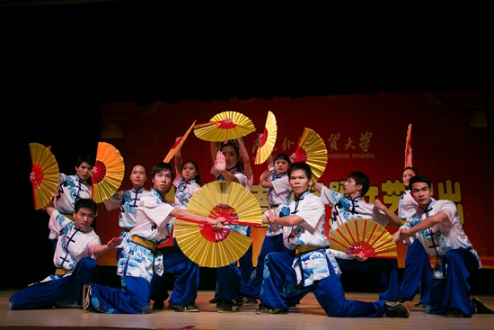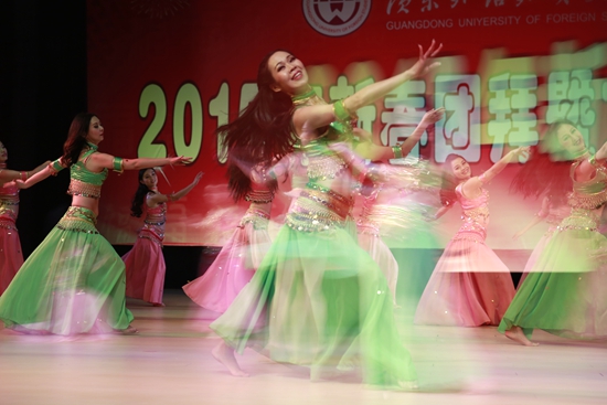校工会选送的女教工表演肚皮舞《东方雅韵》;离退休干部舞蹈队表演古典舞《梦入桃花源》;体育部选送的广袤园武协表演《金扇齐舞》;商英学院教师表演歌伴舞《亲亲茉莉花》;将演出推向一个又一个的高潮,现场气氛热烈掌声不断。演出中插入的抽奖环节也引起观众阵阵欢呼。最后,演出在党委统战部选送表演的歌舞《今夜无眠》中圆满落下帷幕。