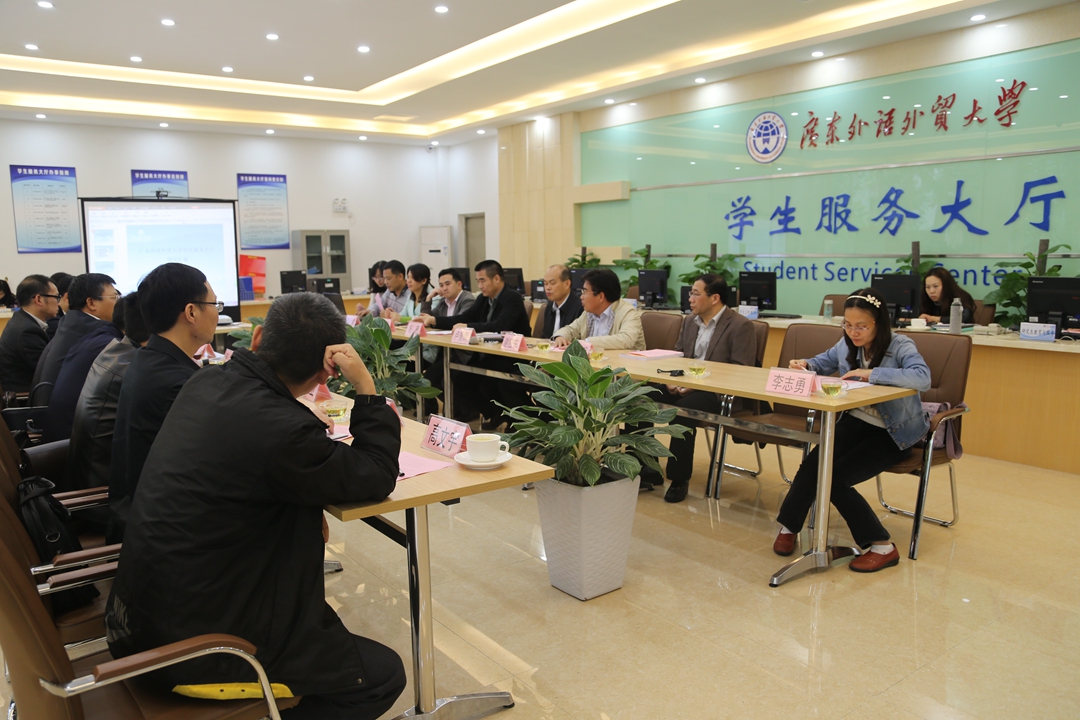 本网讯 2015年3月26日下午,广东财经大学党委副书记吴琦、党委办、校长办主任陈光团等率领相关部处领导来我校考察学生服务大厅的建设成果,并与我校领导交流建设经验。