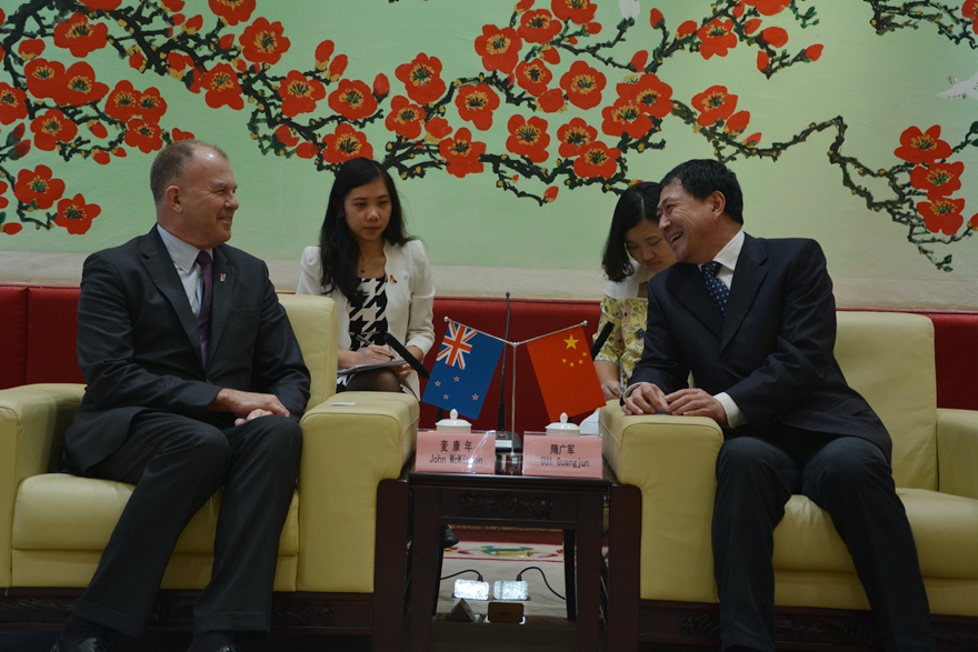 本网讯 4月13日上午,新西兰新任驻华大使麦康年JohnMcKinnon首次访问我校。这是他在广东高校行的第一站。我校党委书记隋广军在北校行政楼贵宾厅与麦康年举行会谈。新西兰驻广州总领事馆总领事陈立恩,总领事馆教育经理叶方珉,总领事馆研究官员谢翩翩,我校副校长方凡泉,国际处处长蔡红,战略研究院副秘书长陈寒溪及相关学院和部处负责人等随同会见。