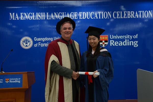 本网讯 4月9日下午,首届广外-雷丁大学英语教育硕士项目毕业典礼在第九教学楼103丝纺讲堂举行。英国雷丁大学教育学院院长Andy Goodwyn教授,Jeanine Treffers-Daller教授,李大国教授,我校党委副书记陈建平,英文学院院长温宾利及相关部处的领导和毕业生及家属出席了典礼。典礼由英文学院王蕴峰博士主持。