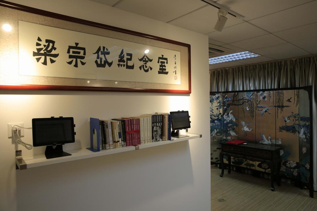 梁宗岱纪念室于2013年11月2日在北校区图书馆四楼建成开展。步入纪念室,放置于纪念室门前的梁宗岱先生的雕像首先映入眼帘,这一由设计名家雕琢的雕像精细得连发丝都清晰可见,刻画了宗岱老先生历经波澜与沧桑后智慧豁达近人的形象。而为彰显梁宗岱本人中西贯通的学术成就以及广外“学贯中西”的校训,纪念室内部主要运用中西结合的设计理念——一边,仿明代的椅子、书柜,带有浓郁古朴气息的屏风,具有岭南特色的房檐,还有特意邀请陈家祠馆长李卓祺题的“梁宗岱纪念室”六个书法大字都展现了中国的古典底蕴;另一边,洁白的纪念墙与极具欧式风格的透明地图则颇具西式风韵。沿着走廊行进,墙上透明的地图刻画出了宗岱先生赴欧游历的路线及于所到之处结识之名家益友。宗岱先生的人生故事随着纪念墙与展品徐徐展开,逐步呈现。