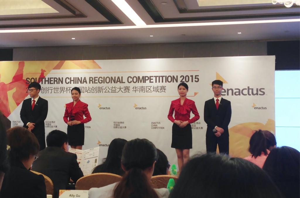 本网讯 日前,2015年创行世界杯中国站创新公益大赛华南区域赛在广州花园酒店举行。我校Enactus创行团队(原SIFE赛扶团队)通过展示“声声妙语”、“知更”两个项目在三进一的小组赛中脱颖而出,以华南区域赛一等奖的成绩晋级全国赛。这是我校Enactus创行团队成立十年以来第十次晋级全国赛。全国赛将于今年5月26日在上海跨国采购中心举行。